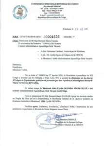 La confirmation émane de la Conférence Épiscopale Nationale du Congo (CENCO), dans une correspondance signée ce mercredi 28 janvier par son secrétaire général, monseigneur Donatien Nshole .
