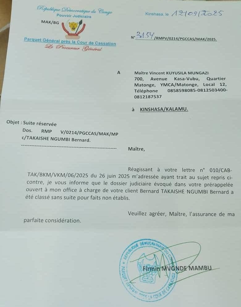 Cadre de l’UDPS, Bernard Takaishe ne fera désormais plus l’objet de poursuites judiciaires . Le Procureur général près la Cour de cassation, Firmin Mvonde, a confirmé que les faits reprochés n’étaient pas établis. Par conséquent, le dossier a été classé sans suite.