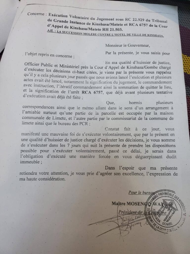 Selon une décision de justice, ces services publics disposent désormais de sept (7) jours pour quitter les lieux, après avoir refusé d’exécuter volontairement l’arrêt rendu par le Tribunal de grande instance de Kinshasa/Matete dans l’affaire opposant la famille Molebe à l’Hôtel de ville de Kinshasa.