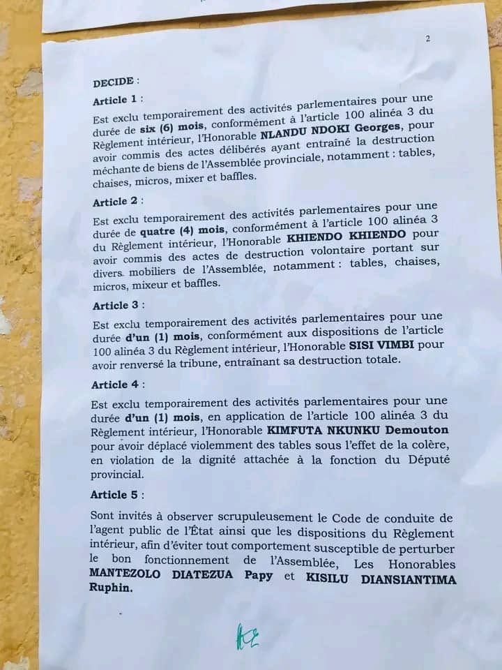 Ils sont tous exclus temporairement des activités parlementaires de leur province. Il s’agit des députés Nlandu Ndoki Georges (sanctionné pour 6 mois, soit la peine la plus lourde), Khienda Khienda (4 mois), ainsi que Sisi Vimbi et Kimfuta Nkunku, chacun sanctionné pour 1 mois.