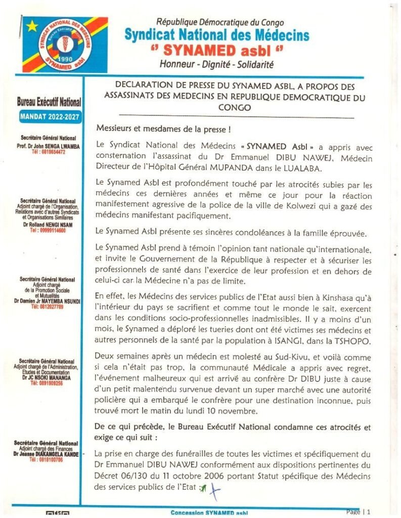 Le SYNAMED déplore ce décès inacceptable, qui vient allonger la liste des pertes de médecins des services publics, aussi bien à Kinshasa que dans les provinces, victimes de traitements inhumains. Le syndicat cite notamment le cas malheureux de deux médecins tués par la population à Isangi, dans la province de la Tshopo et au sud Kivu où un autre médecin a été tabassé .