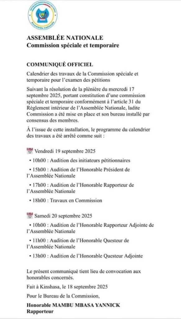 Selon le calendrier publié par le député national Mambu Mbasa, rapporteur de la Commission spéciale , les travaux débuteront par l’audition des initiateurs de la pétition, dans le but de mieux comprendre leurs motivations et attentes.