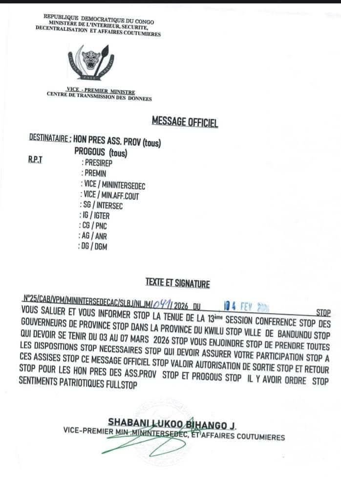 Ça y’est, le suspens est désormais levé autour de la tenue prochaine de la 13ᵉ conférence des gouverneurs des province. Après le Lualaba, c’est la province du Kwilu qui accueillera du 3 au 9 mars prochain cet important rendez-vous national marqué comme d’habitude par la participation autour du chef de l’Etat des 26 gouverneurs, des membres des organes exécutifs et législatifs provinciaux nationaux .